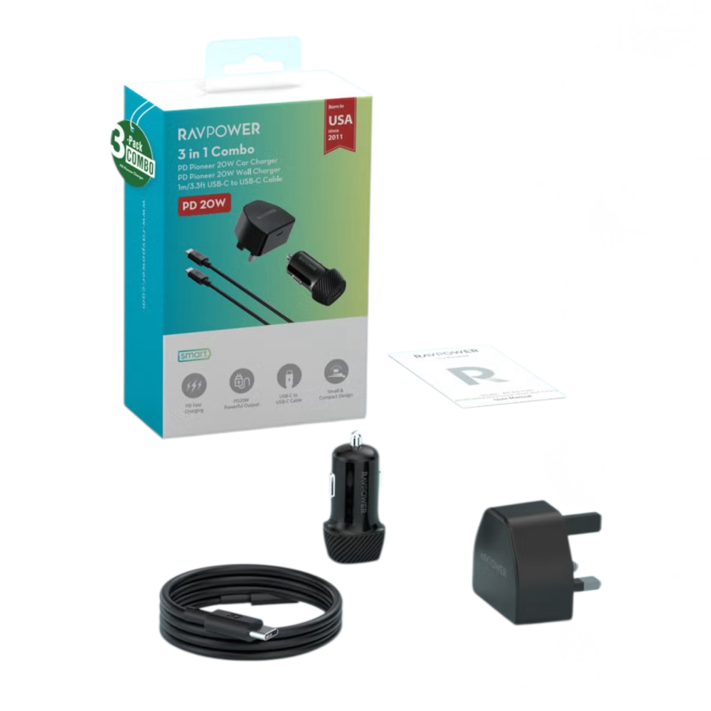بكج راف باور شاحن سياره بايونير 49 واط بمنفذين + شاحن جداري 20 واط + كيبل تايب سي تو لايتنينق بطول 1 متر + كيبل تايب سي تو تايب سي 1 متر