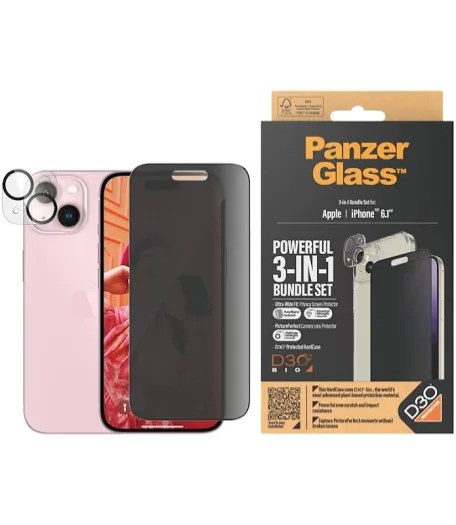 بكج حماية بانزر جلاس شاشة وكفر ايفون 15 مع مادة D30 ممتصة للصدمات - شاشة كاملة حفظ الخصوصية