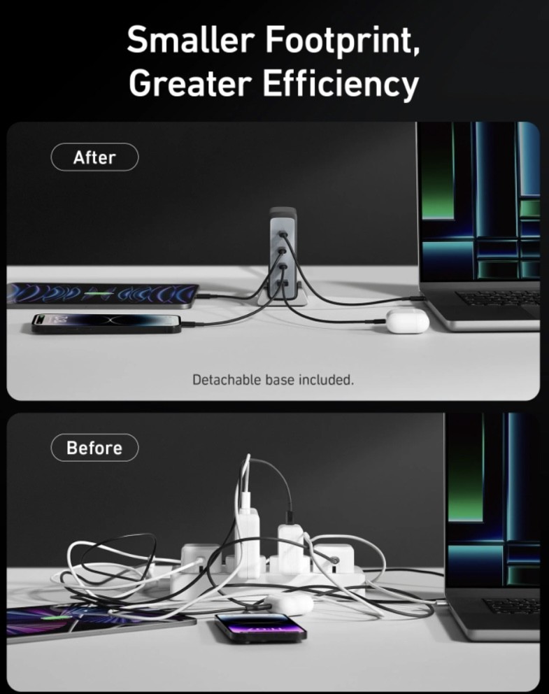 يتميز الشاحن بتصميم مدمج وقاعدة قابلة للفصل، مما يوفر مساحة عمل نظيفة ومنظمة دون فوضى أسلاك الشحن، كما يوفر شحنًا فعالًا وموثوقًا.