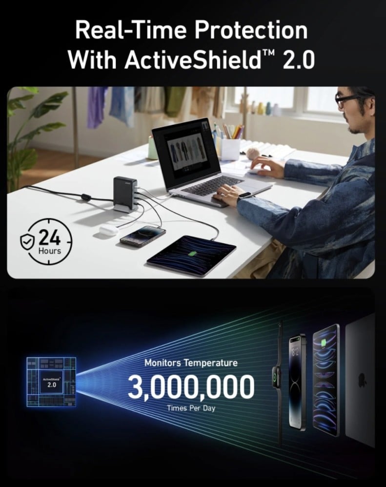 يوفر نظام السلامة ActiveShield™ 2.0 رصدًا في الوقت الفعلي لدرجة الحرارة، ويجري 3 ملايين فحص يوميًا لضمان أداء الشحن الأمثل والحماية الكاملة.