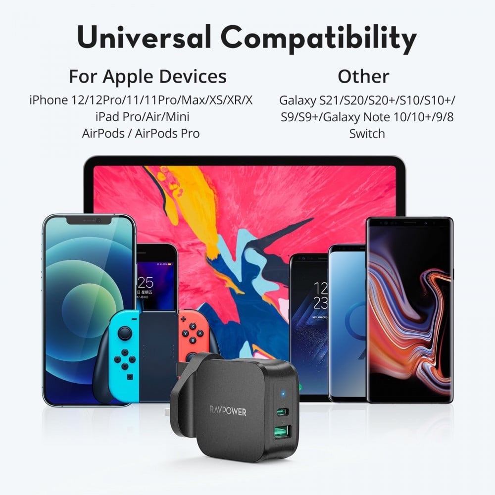 - الشحن القياسي لمعظم الهواتف ويدعم الشحن السريع بأحدث طرازات الهواتف مثل iPhone XS Max و Galaxy S8 + والأجهزة اللوحية مثل iPad Pro 2018 وأجهزة Type-C الأخرى.