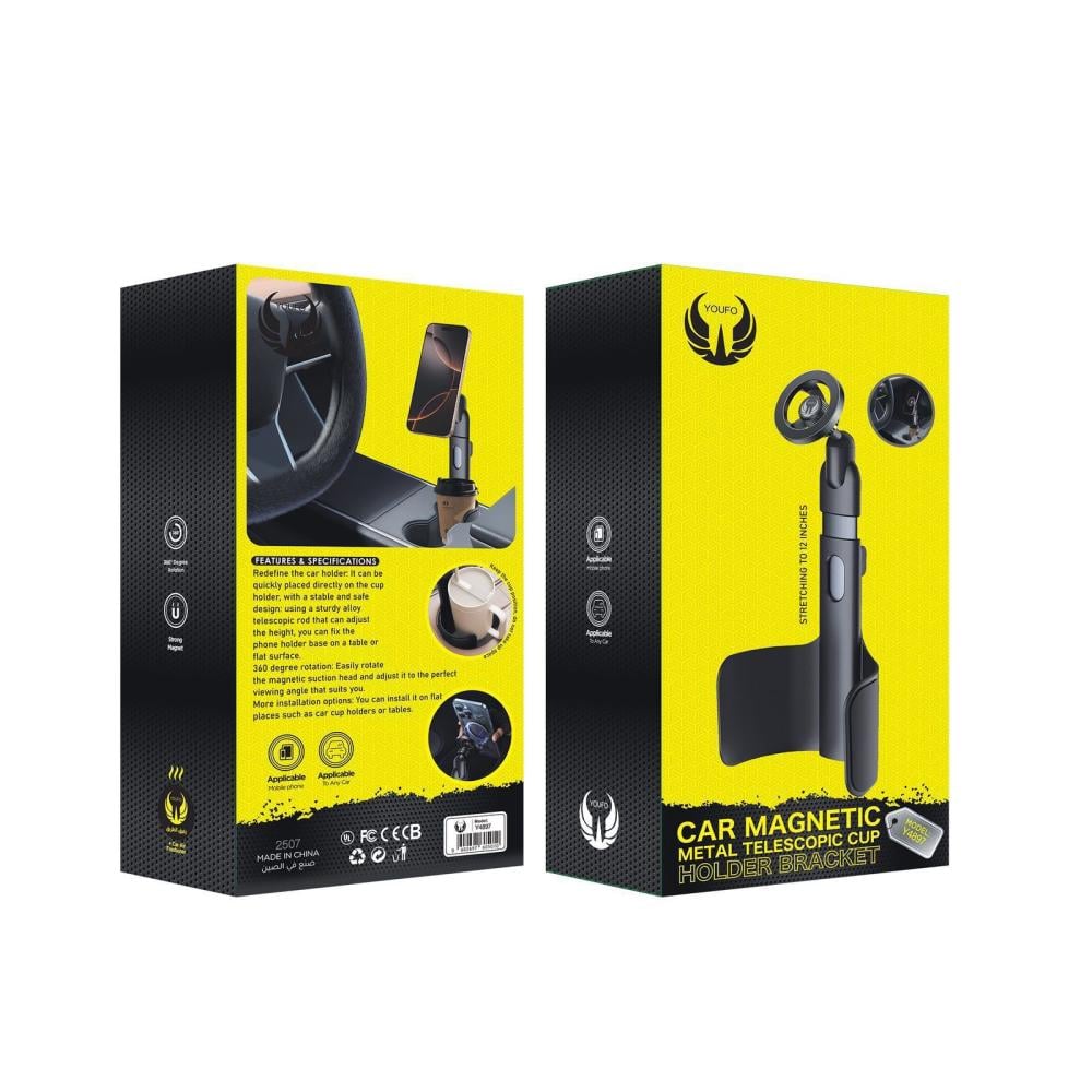 استمتع بقيادة آمنة مع حامل جوال يوفو 2 في 1 المغناطيسي 🤳🔒 تثبيت قوي ومستقر في مكان كوب السيارة، ذراع مرن دوران 360 درجة، وتوافق واسع.