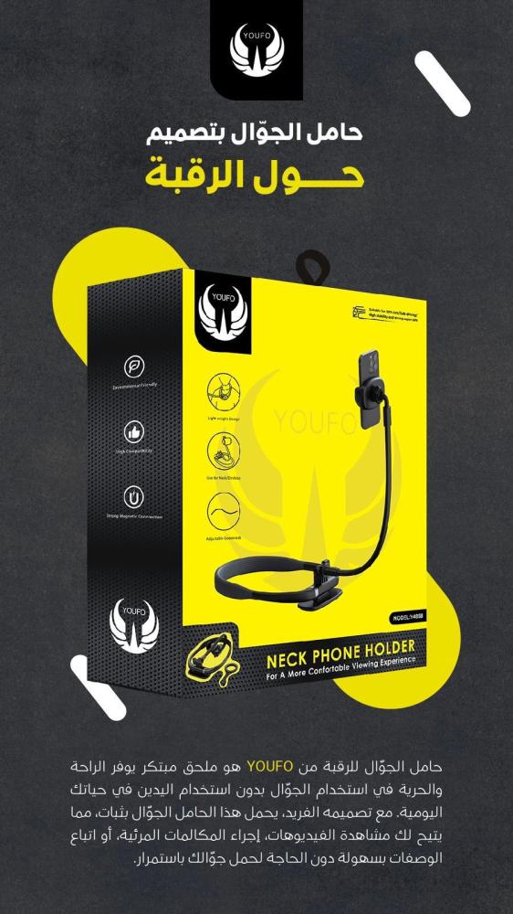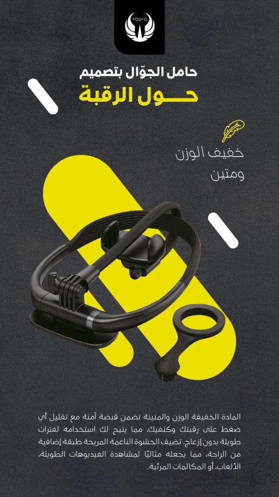حامل الجوّال للرقبة من YOUFO هو ملحق مبتكر يوفر الراحة والحرية في استخدام الجوّال بدون استخدام اليدين في حياتك اليومية. مع تصميمه الفريد، يحمل هذا الحامل الجوّال بثبات، مما يتيح لك مشاهدة الفيديوهات، إجراء المكالمات المرئية، أو اتباع الوصفات بسهولة دون الحاجة لحمل جوّالك باستمرار.